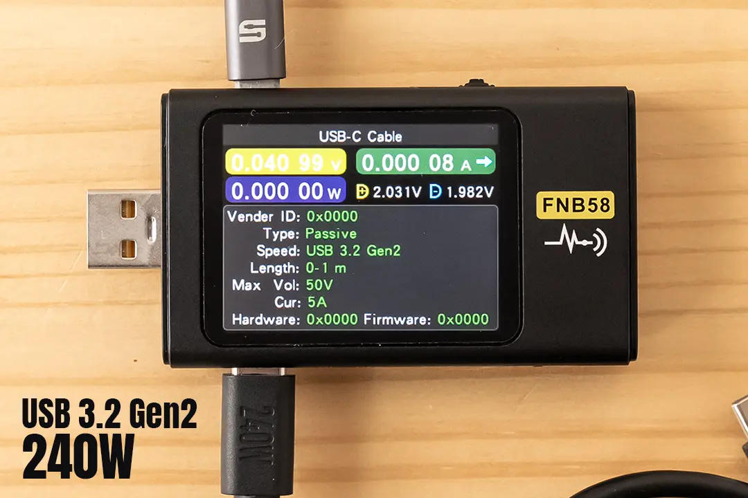 USB 3.2 Gen2 240WのほうはUSB 3.2 Gen2で50V/5Aと表示されています。これは以前のものと表記は同じですね。