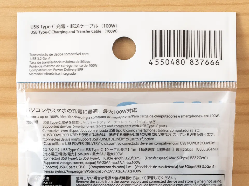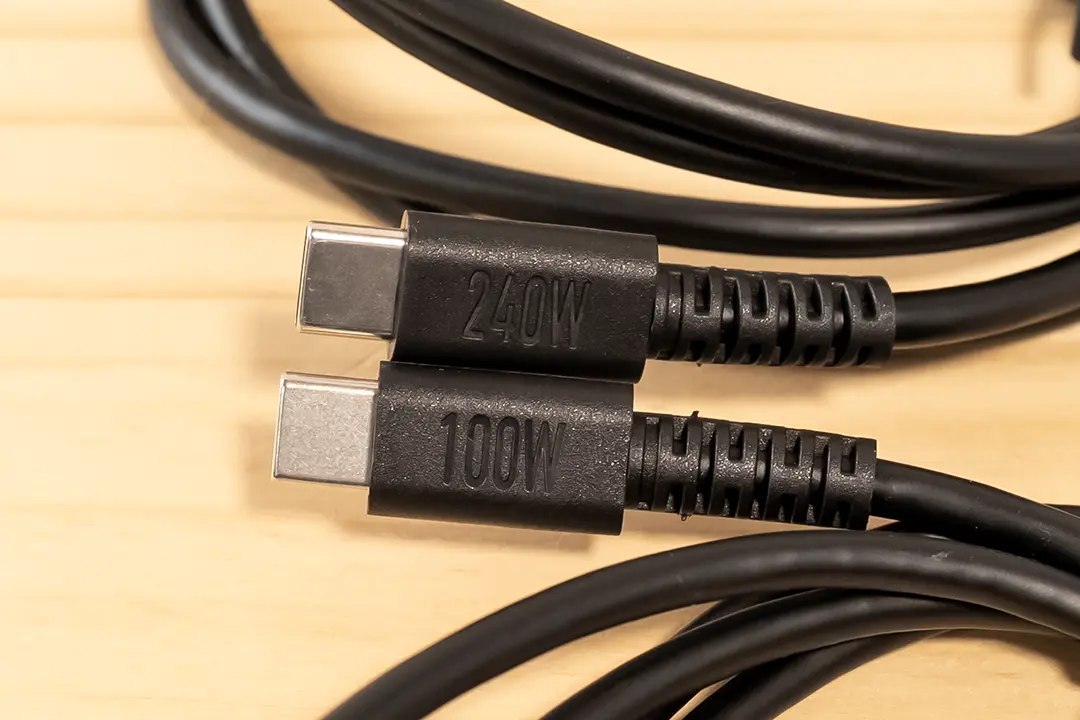 よく見るとコネクタ部分に「100W」「240W」と書かれています。これなら区別がついてわかりやすいですね。両端どちらにも書かれています。ただしUSB 3.2 Gen1/Gen2の表記はありません。