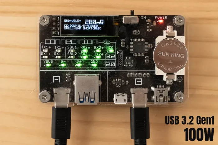 USB 3.2 Gen1 100Wのほうは抵抗値が200mΩでeMarkerもあります。2.0の枠は全部光っていて、3.2の枠はTX1+, TX1-, RX1+, RX1-, SBU1, SBU2が光っていません。マニュアルによるとTX1/2 及び RX1/2は「USB3.0以降での 通信を行うワイヤ」で、「USB3.0では2対のワイヤを使ったデータ通信(SuperSpeed /SS)を、USB3.2以降では4対のワイヤを使ったデータ通信(SuperSpeed+ / SS+)を行います」とのこと。あれ?TX2+, TX2-, RX2+, RX2-の2対しか光ってない…?