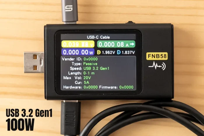 USB 3.2 Gen1 100Wのほうは今回はちゃんとUSB 3.2 Gen1で20V/5Aと表示されています。eMarkerの中身もちゃんとリニューアルされています。