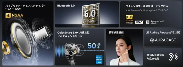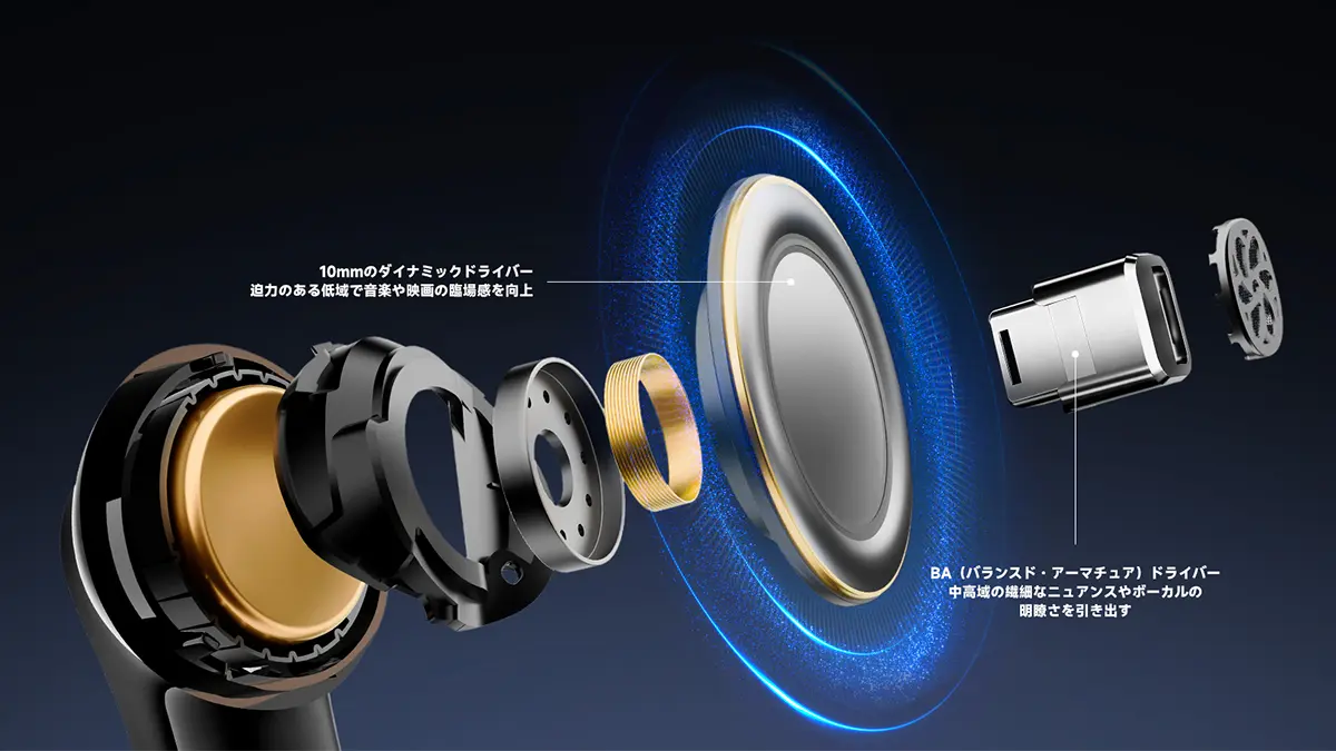 EarFun Air Pro 4+は10mmダイナミックドライバーとEarFun自社開発の業界最小クラスバランスド・アーマチュア(BA)ドライバーを組み合わせたハイブリッド構造を採用しています。ダイナミックドライバーは中低域に厚みを持たせ迫力ある低音を、BAドライバーは高域を明瞭に表現し、全音域でバランスの取れた臨場感あるサウンドを楽しめるとしています。
