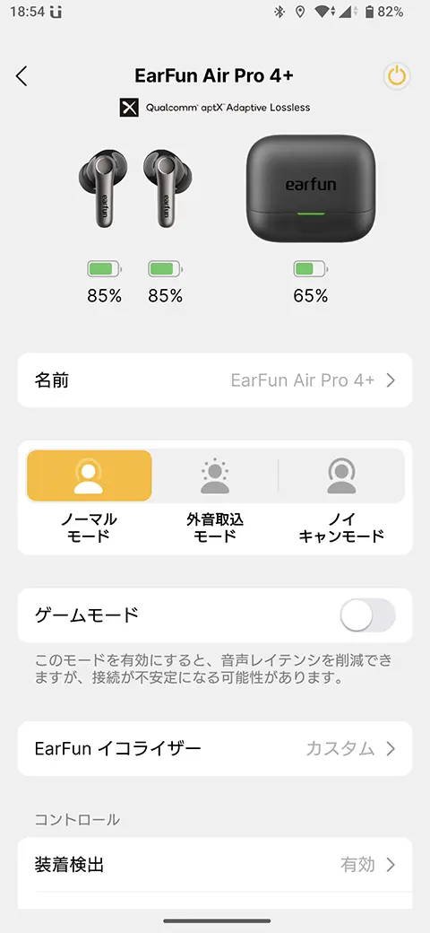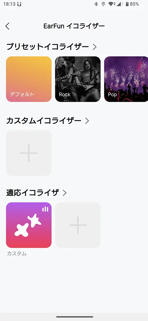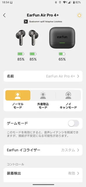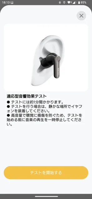 管理アプリのイコライザー機能に、聴力テストして調整してくれる「適応イコライザ」もあります。これを適用したら音がはっきりして細かい音も聞こえて迫力もでたように感じます。ノーマルで聞くよりも、自分に合わせたイコライザを使ったほうがいいかもしれませんね。