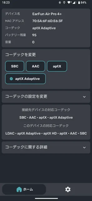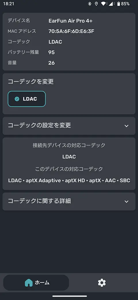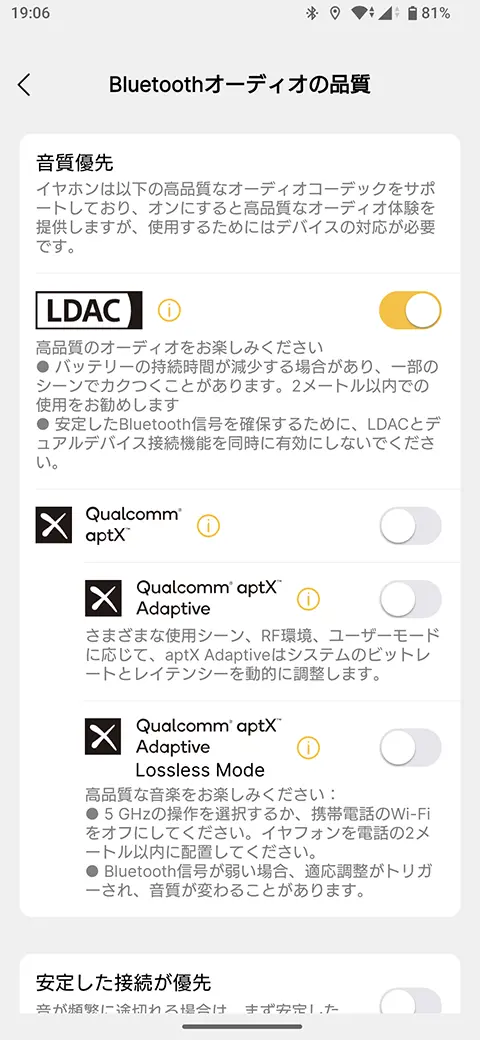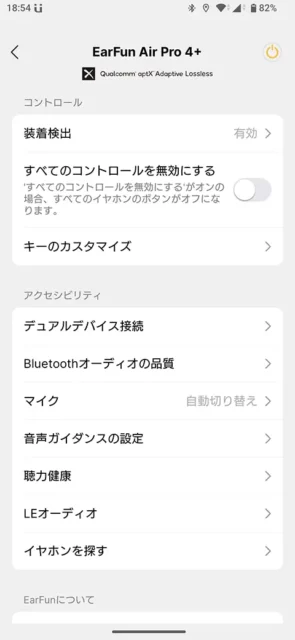 EarFun Air Pro 4+はAACとSBC、aptX AdaptiveのほかLDACやaptX Losslessにも対応しています。また、これまでデュアルデバイス接続はLDACと両立できなかったのが、両立できるようになっています。(ただ、音が途切れる場合があるのでオフにするのをオススメする、と注意が表示されます。)