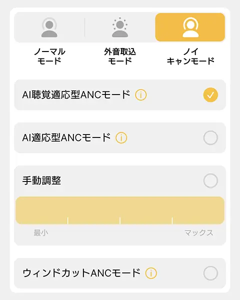 ノイキャンの設定はAir Pro 4iよりもさらに進んでおり「AI聴覚適応型ANC」「AI適応型ANC」「手動調整」「ウインドカットANC」の4つのモードがあります。手動調整は4段階で強度を調整できます。
