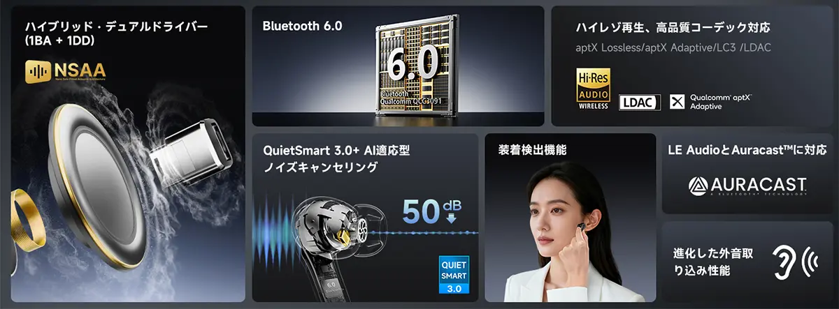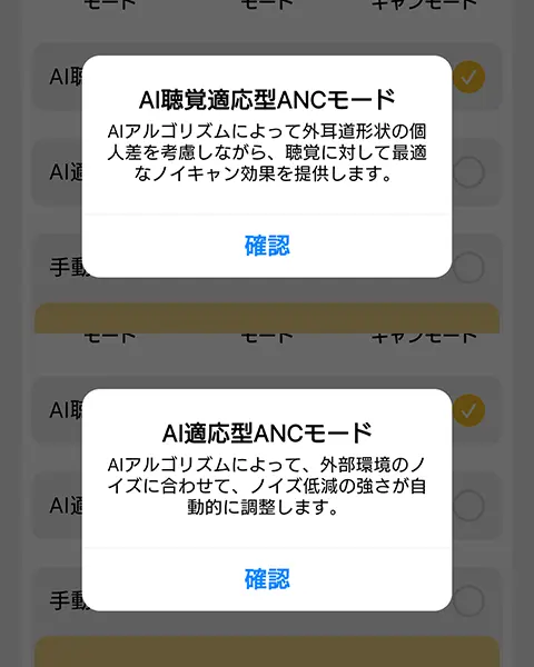 「AI聴覚適応型ANC」は外耳道形状の個人差を考慮しながら最適な効果を提供し、「AI適応型」はAIが周囲の環境をリアルタイムで分析し、自動でノイズ低減の強さを調整してくれます。