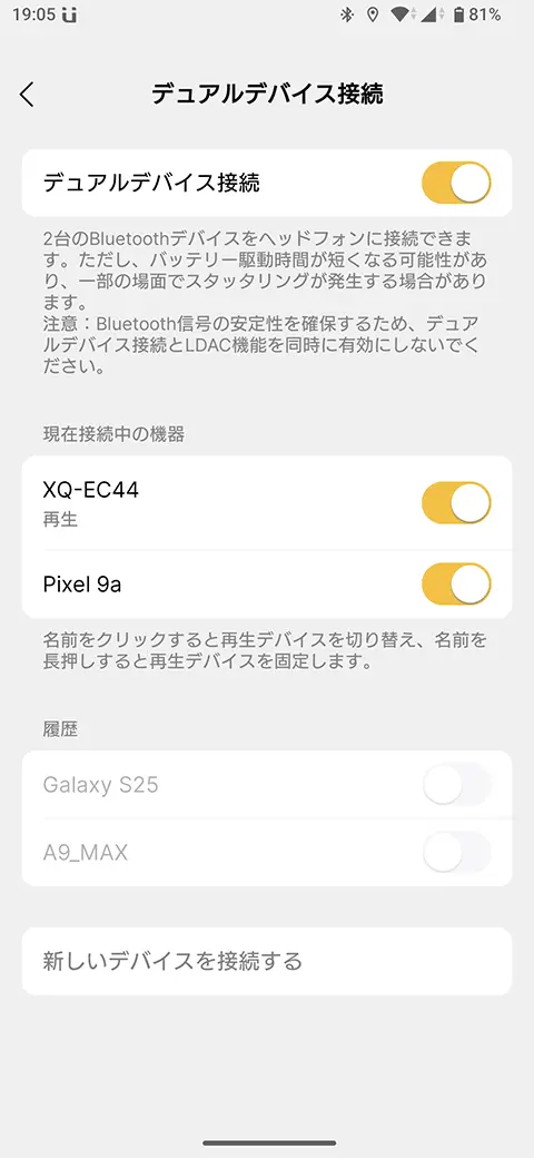 また、これまでのEarFunデバイスではデュアルデバイス接続はLDACと両立できなかったのが、両立できるようになっています。ただし、音が途切れる場合があるのでオフにするのをオススメする、と注意が表示されます。