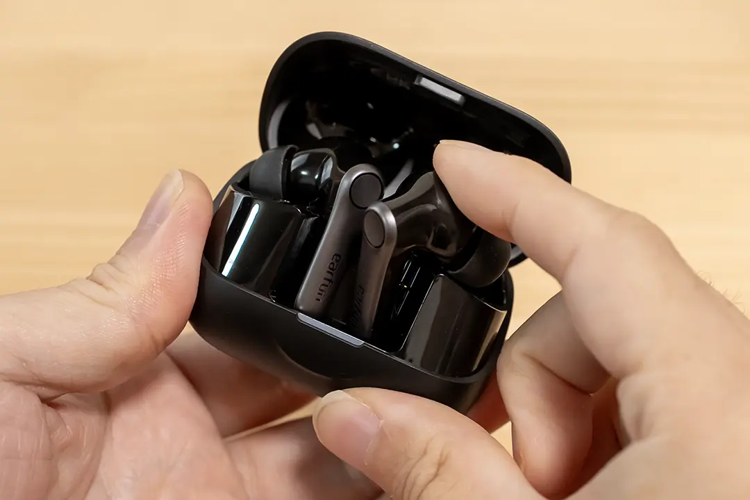 ケースの開き方がこれまでのEarFunのものとは異なっており、斜めに取り出すような形になっています。