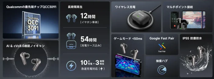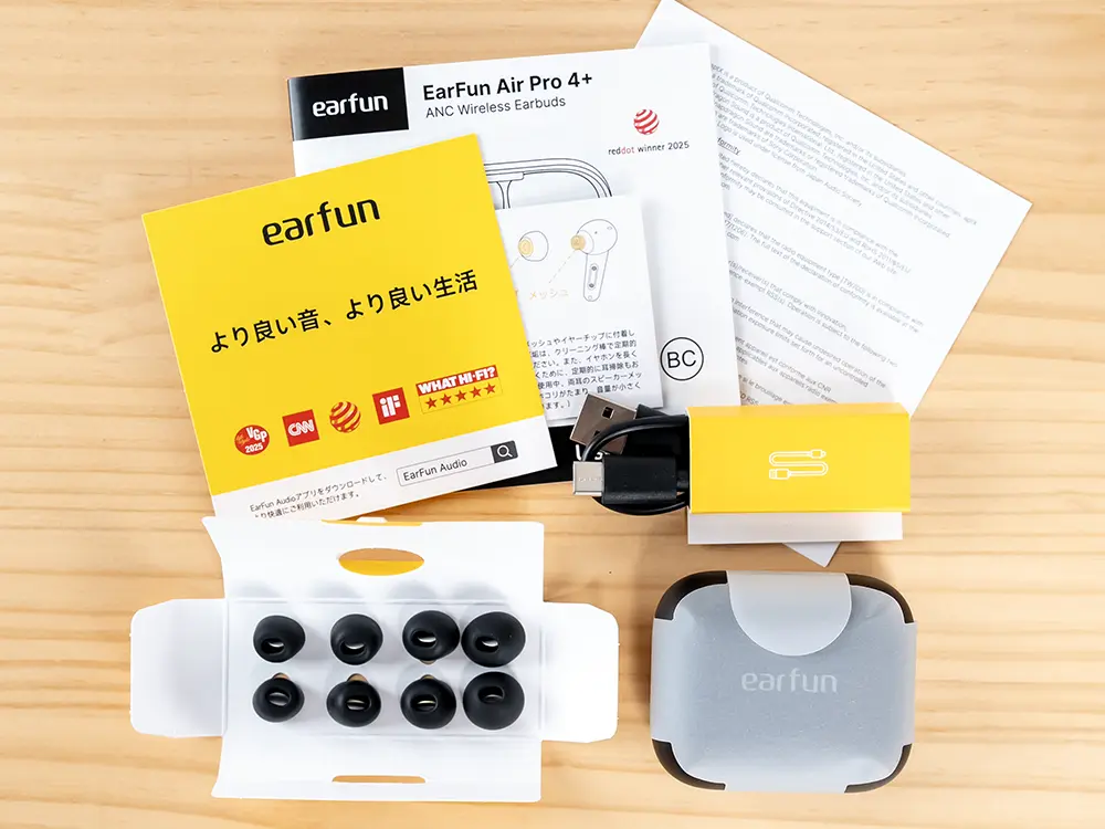 名称としては夏に発売されたEarFun Air Pro 4iと同じく昨年発売のEarFun Air Pro 4の派生モデルのようです。とはいえハイブリッドドライバーや最大50dBのノイズ低減ANC、高音質コーデックのサポートなど、数多くの先端技術で機能はますます充実しており、たしかに「+」な上位版のようです。