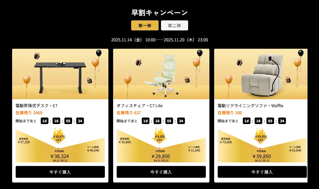 まずは14日から早割キャンペーンとして、電動昇降式デスク・E7が33%オフ、オフィスチェア・C7 Liteが25%オフ、電動リクライニングソファ・Waffleが25%オフになります。