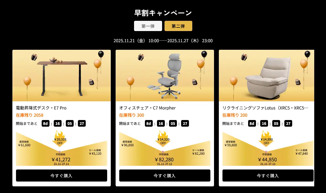 11月21日からは早割キャンペーン第2弾として、電動昇降式デスク・E7 Proが33%オフ、オフィスチェア・C7 Morpherが15%オフ、リクライニングソファLotusシリーズが25%オフになります。