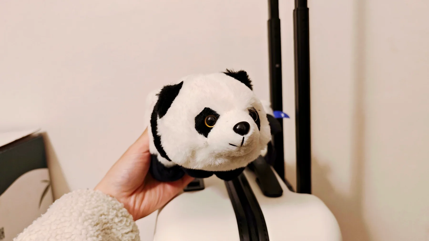 付属のアクセサリーを付けるとこのようになります。パンダの耳に見立てたアクセサリーになっていて、両面テープで貼り付けます。ただこのアクセサリーを付けると、おそらく3辺合計が115cmを超えてしまうので、飛行機の機内に持ち込みたい場合は付けないほうが良さそうですね…