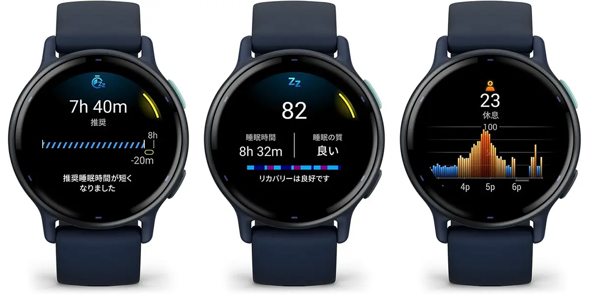 睡眠コーチ付きの睡眠モニタリング機能では睡眠の質を100点満点で採点してくれます。また心拍数やストレス計測、日々の体力をBodyBatteryとしてスコア化。どれだけエネルギーを消費したか、回復できたかを把握できます。