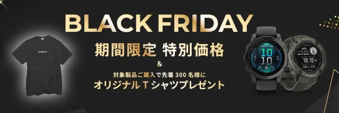 Amazonだけでなく、ガーミンの公式サイトでも11月28日よりブラックフライデーが開催されています。こちらはスマートウォッチ各種が特別価格となっているだけでなく、対象商品購入で先着300名にオリジナルTシャツがプレゼントされます。Amazonでの価格とはまた異なるようなので、こちらもぜひチェックしてください。