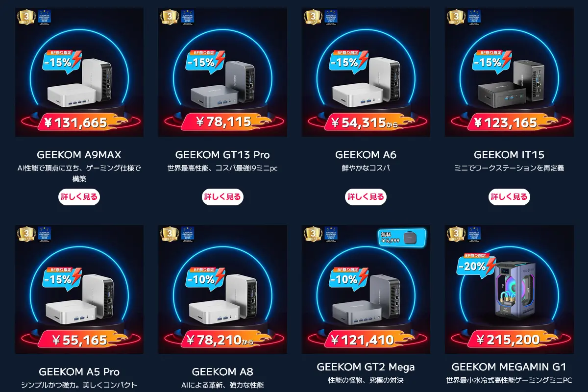 GEEKOMのブラックフライデーセールは公式サイトとAmazonで行われています。微妙に価格が違うので、ポイントなども含めて自分の得な方で購入するといいでしょう。