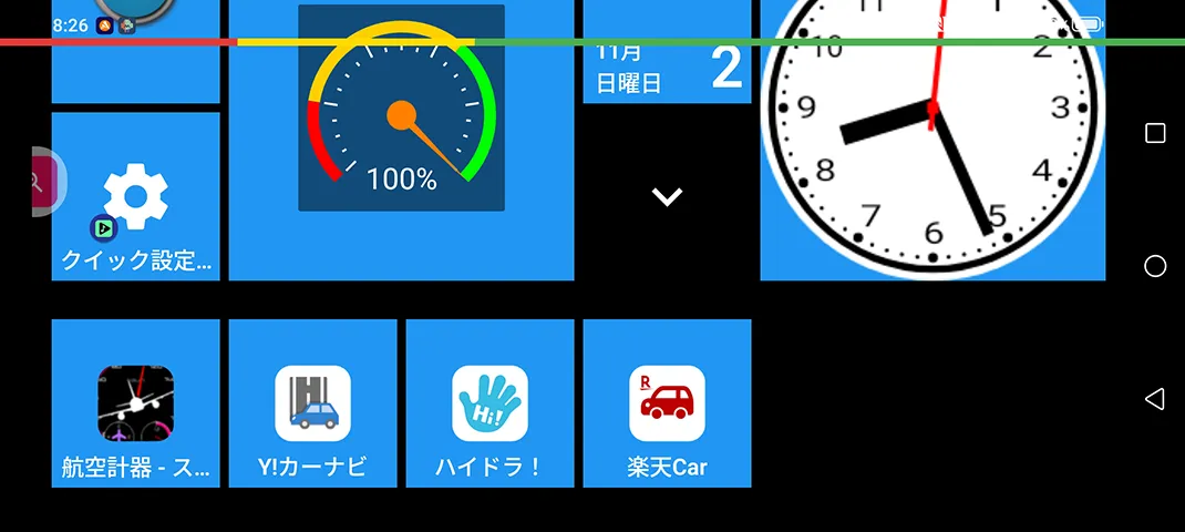 使っているホーム画面アプリが“スクエアホーム”なので、縦横別のレイアウト設定ができる。 せっかくある機能なので、横向き画面を作ってみた。 横向き画面は、車載用として作成。 1.以下、使用ウィジェット。(左から) 2.青色ボタンをタップで、車載モードへ移行する。(MacroDroidでマクロを組んである) 3.このまま走り出してもOK。OKだけど……。 4.タイルグループ(小タイルが並んでいる)をタップすると……。 5.開いたタイルグループから、クルマ用アプリを作動させることも可能。 |