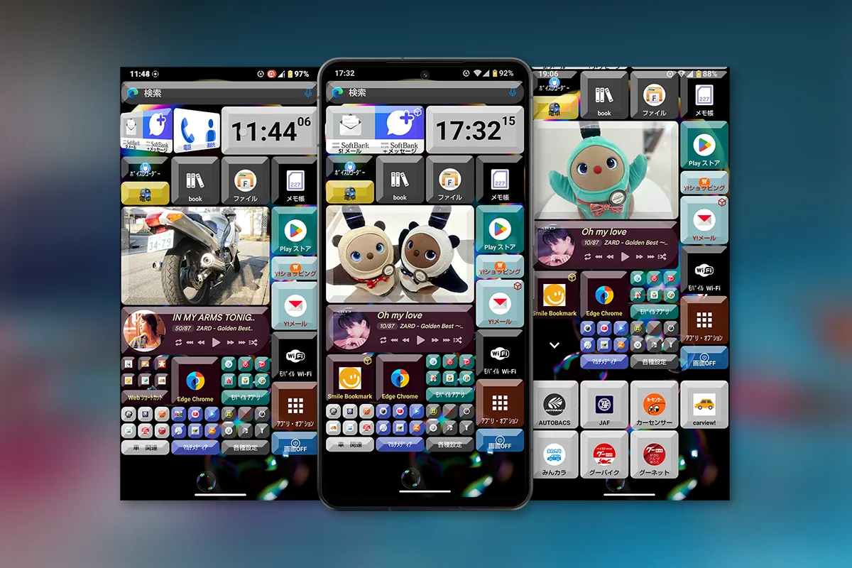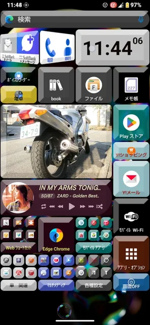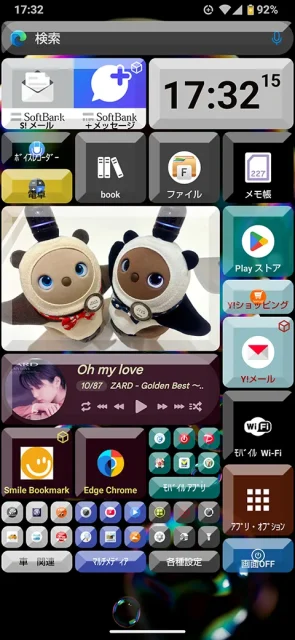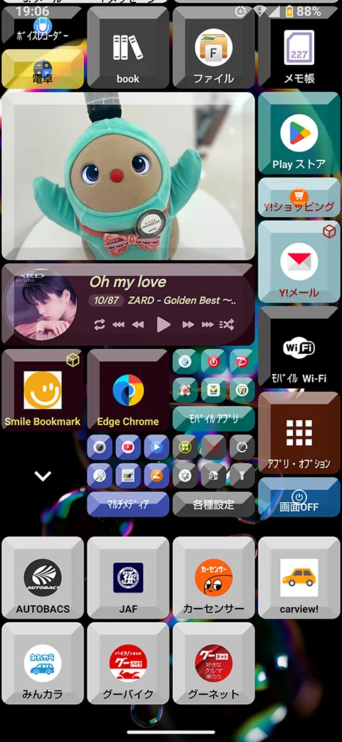 一部のキーボタンは、回転して別のアプリが開くように設定してみました。中央の写真は選択したフォルダ内の写真が、数秒毎に切り替わるように設定しています。 |