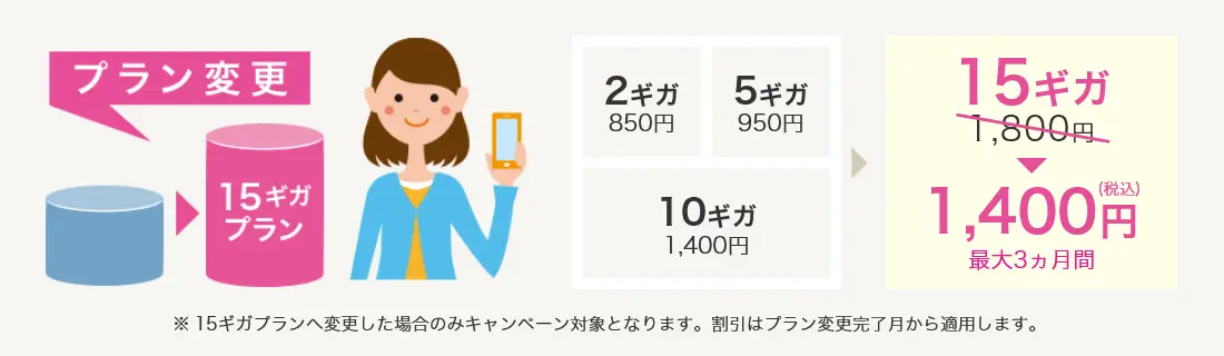 期間中にIIJmioギガプランの「音声SIM」または「音声eSIM」を利用中の回線を、15ギガプランへプラン変更すると、月額料金から400円が最大3ヶ月間割引されます。