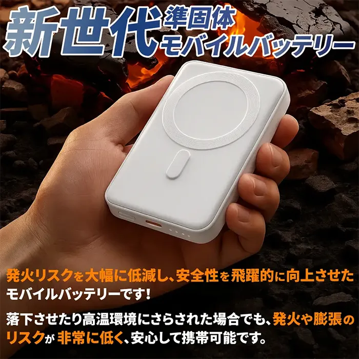 最近モバイルバッテリー等のリチウムイオン電池を使った製品の発火事件などが増えています。従来のリチウムイオン電池は「発熱」「膨張」「劣化スピード」といった課題を抱えており、そういった中で固体電池、準固体電池を使ったモバイルバッテリーが注目されつつあります。