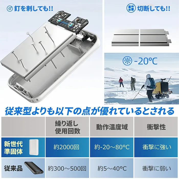 今回発売されるモバイルバッテリーは、固体電解質を部分的に導入した準固体電池を使ったモバイルバッテリーです。液体電解質に比べて発火リスクを大幅に低減しつつ、高出力・長寿命を両立しました。