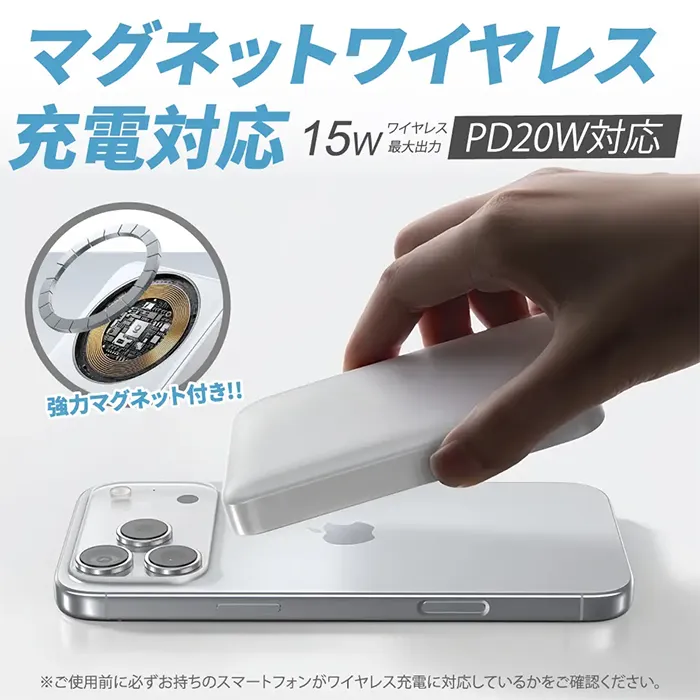 モバイルバッテリーとしてはUSB-Cの単ポートで最大20W充電できるようですのPD充電に対応します。また最大15Wのワイヤレス充電にも対応。マグネットが付いてるのでQi2対応のスマートフォンやマグネット対応のケースなら貼り付けて利用できます。