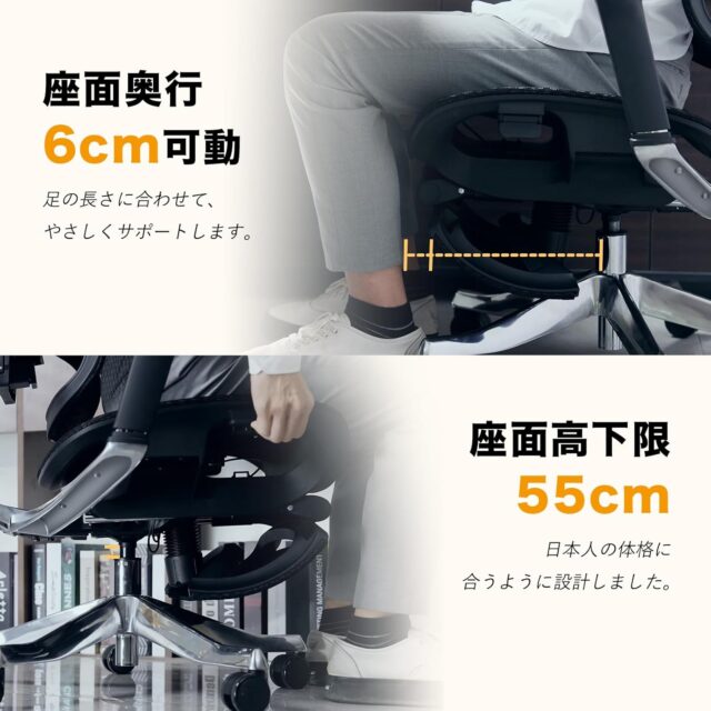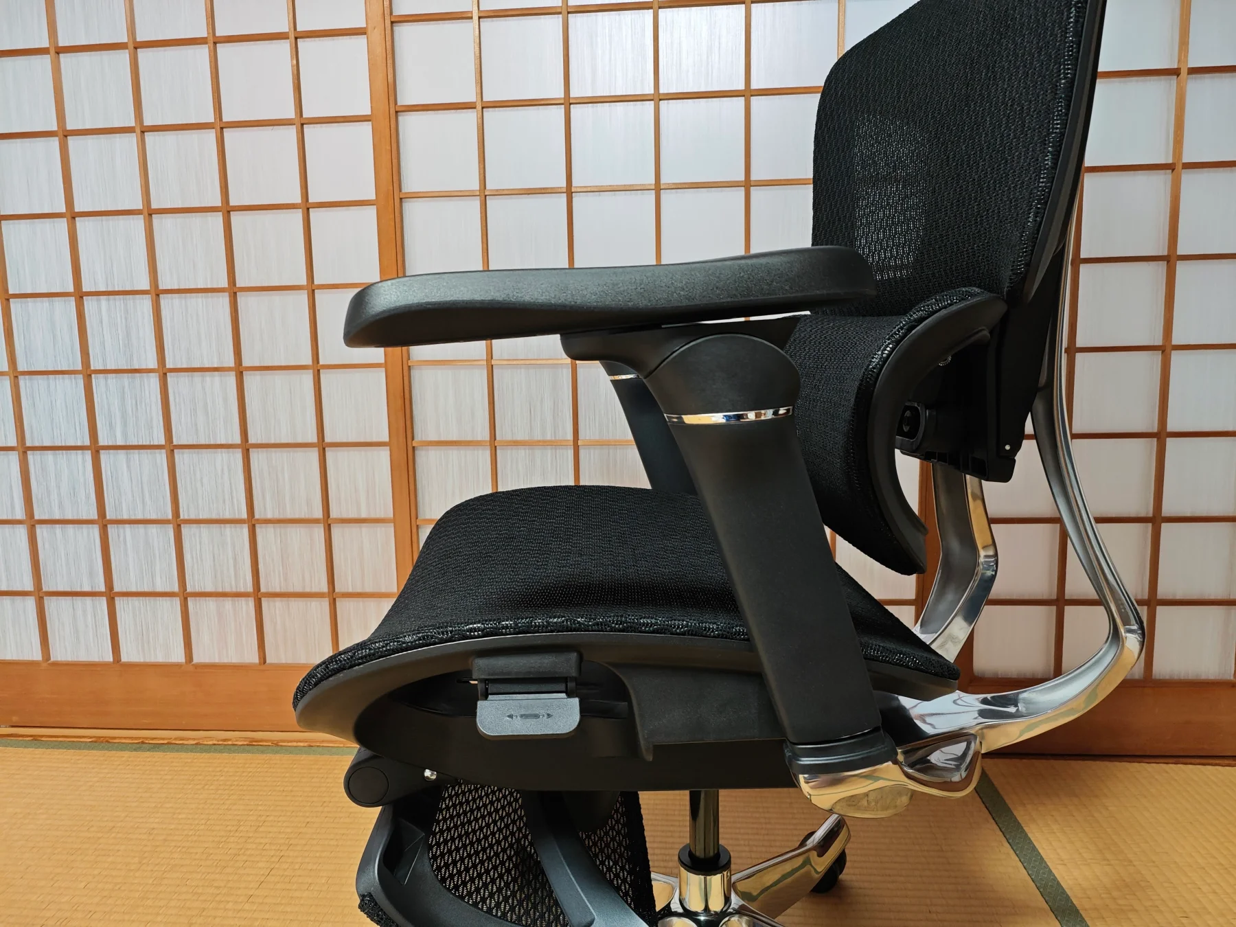 座面の前後位置の調整もできます。座面の高さは日本人の体格に合わせて少し低めに調整されているようです。個人的には1番高い位置にしてちょうどいいくらいなので、もう少し高くできても良いのになーと思いました。