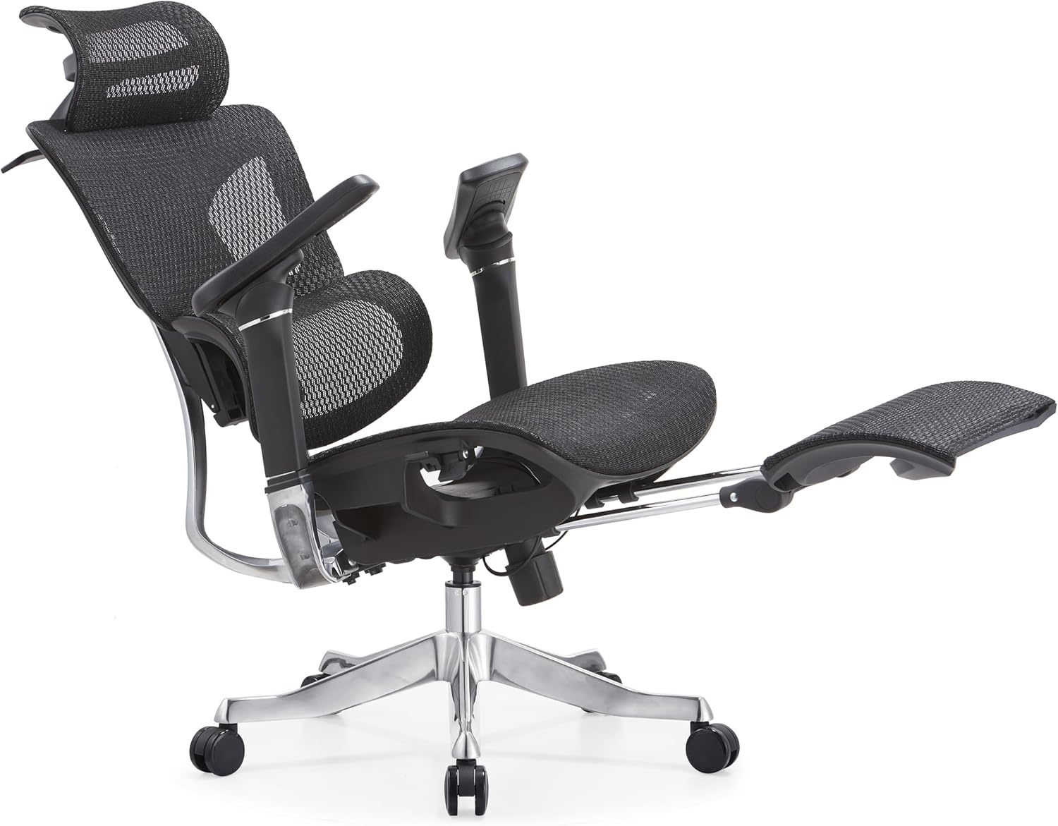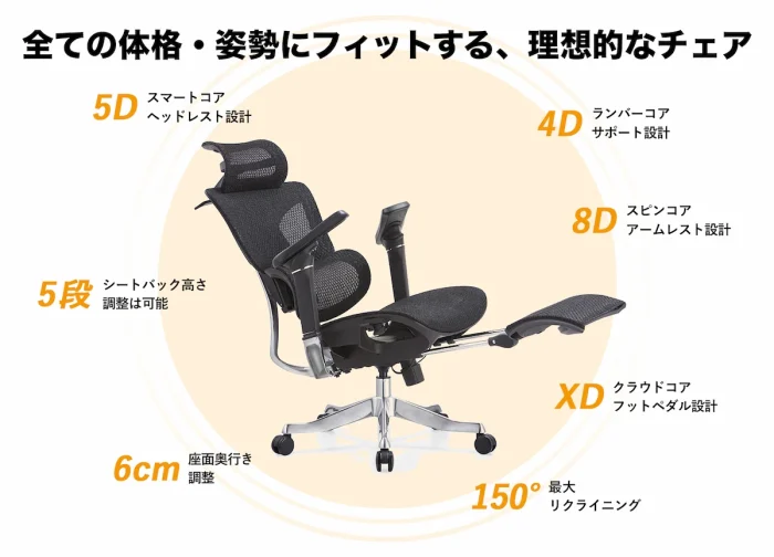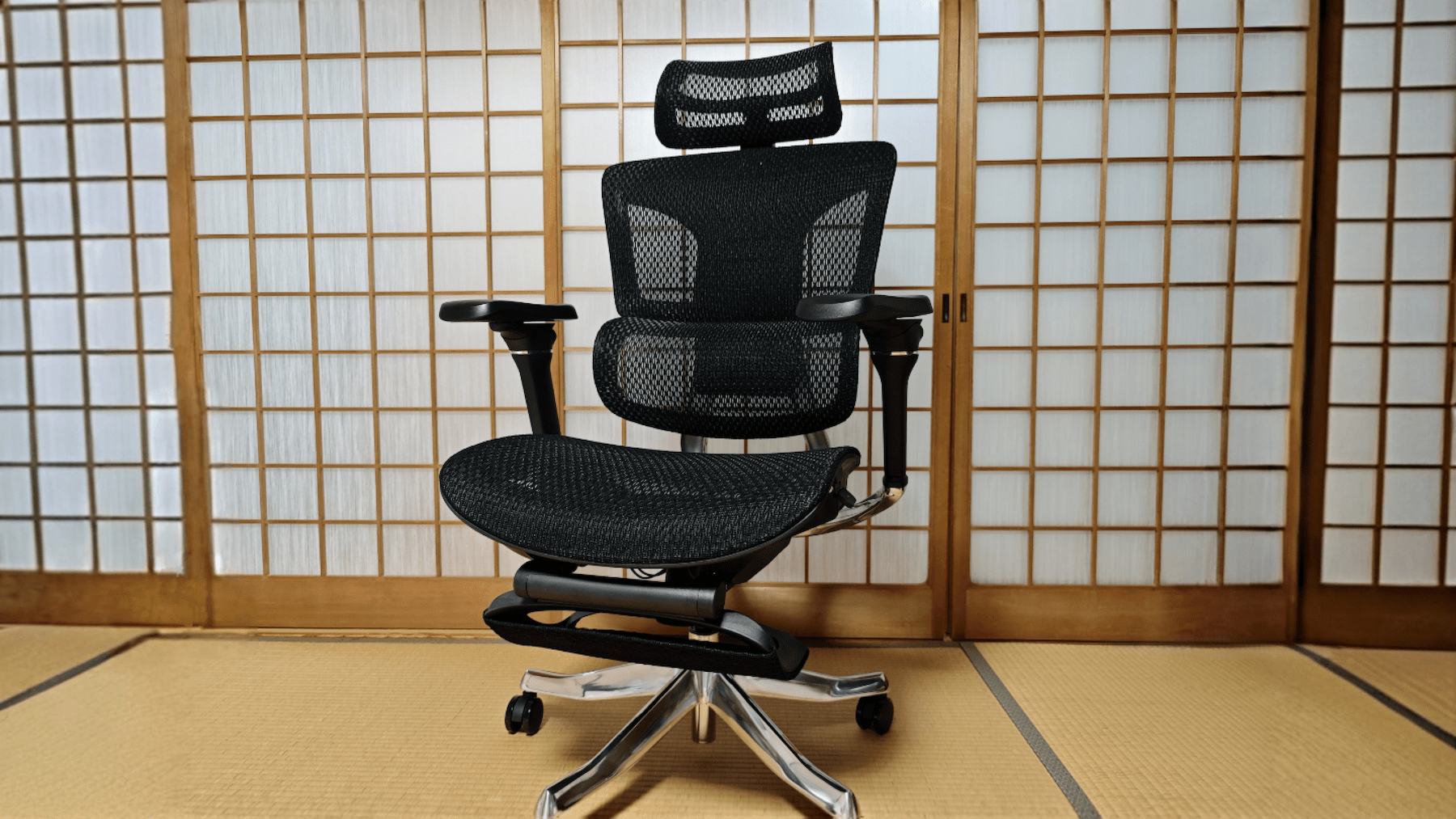 KTOW PAX4は約7.5万円(2025年11月時点)で、可動箇所と範囲が豊富なエルゴノミクスチェアです。座面はメッシュ素材でヘッドレストにフットレスト、ランバーサポートもあります。カラーはブラックとホワイトの2色で、今回はブラックを提供していただきました。
