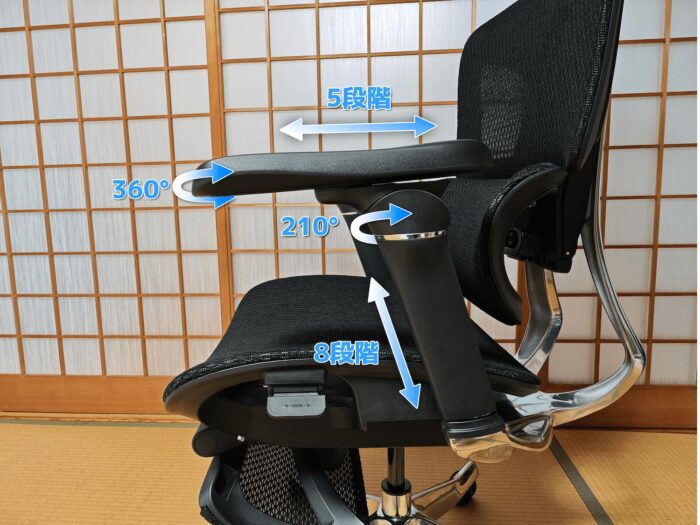 アームレストの高さ、前後位置、土台の向きなどが調節でき、水平方向の向きに至っては360°回転できるほどです。