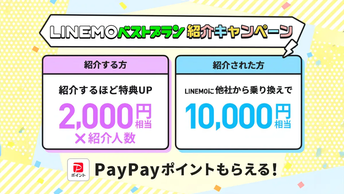 LINEMOベストプラン紹介キャンペーンは紹介者が発行した「専用申込URL」を被紹介者に共有し、被紹介者がそのURLからLINEMOの「LINEMOベストプラン」または「LINEMOベストプランV」に他社からの乗り換え(MNP)、または新しい電話番号で契約すると、紹介者にPayPayポイントがプレゼントされます。