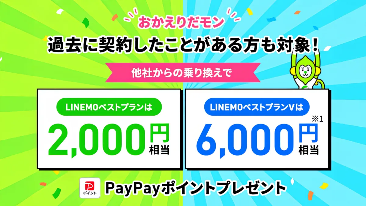 LINEMOおかえりだモンキャンペーンは、専用キャンペーンページを経由して、過去にLINEMOを契約したことのある方がLINEMOの「LINEMOベストプランV」または「LINEMOベストプラン」に他社からの乗り換え(MNP)で申し込むとPayPayポイントがプレゼントされるキャンペーンです。