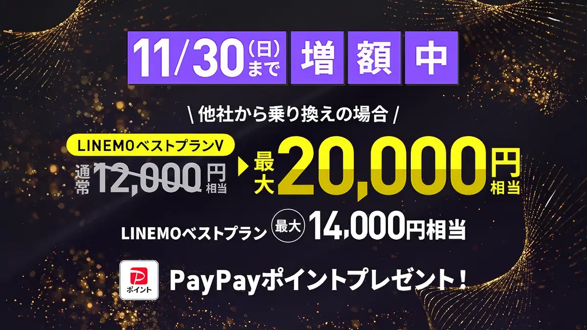 - (LINEMO週穫祭11月第4弾)最大20,000円相当プレゼント!PayPay 増額キャンペーンを開始します!11月30日(日)まで!|新着情報|お知らせ|【公式】LINEMO – ラインモ|格安SIM