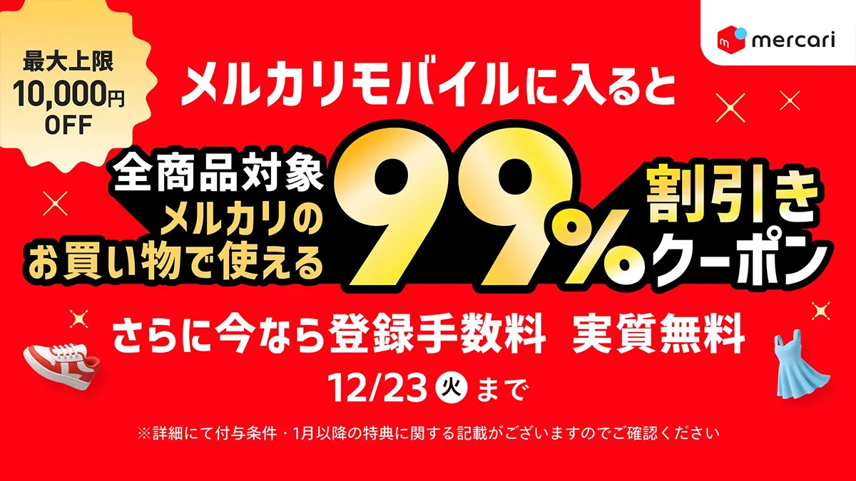 メルカリモバイルは11月5日より、初めてメルカリモバイルを申し込むとメルカリでの買い物に使える99%割引クーポン(最大上限10,000円)がもらえるキャンペーンを開始しました。さらに、登録手数料が実質無料(登録手数料相当分として3,300ポイントを還元)の特典もあります。