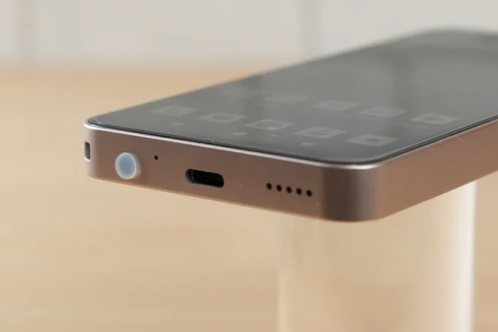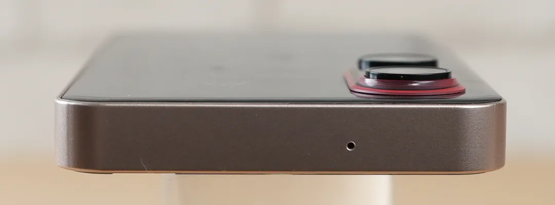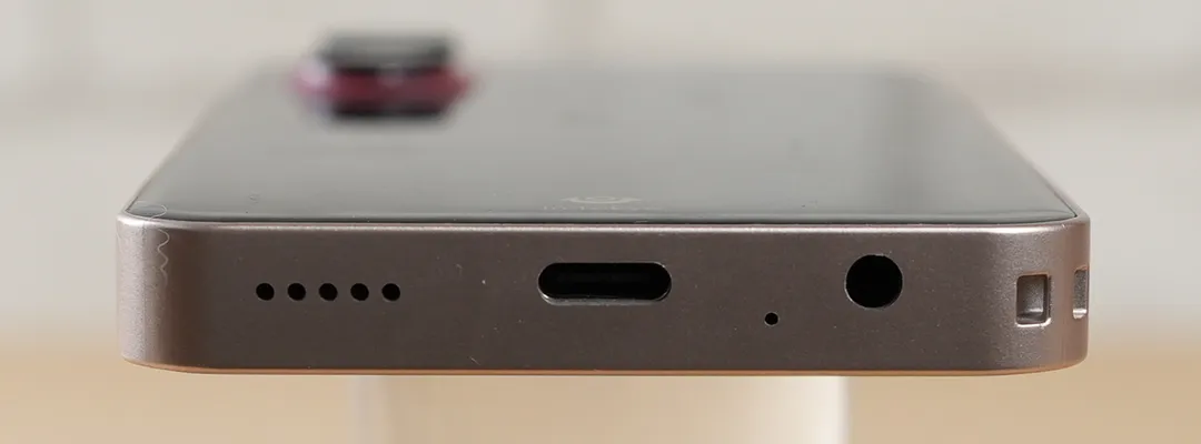 上側面にはマイク穴。舌側面にはスピーカーとUSBポート、イヤホンジャック、角にストラップホールがあります。