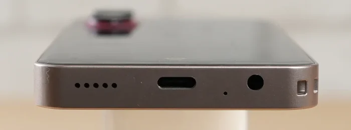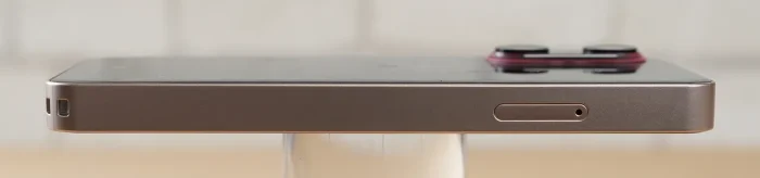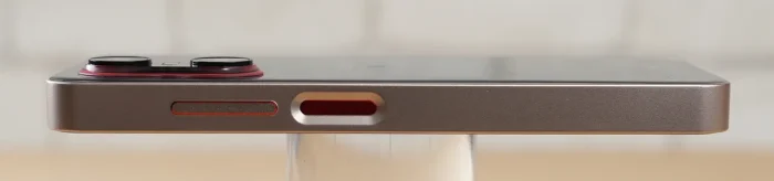 右側面に音量ボタンと指紋センサー兼の電源ボタン。音量ボタンにも微妙に赤が使われています。電源ボタンは少し凹んだ場所にあります。触れるのは問題ないのですが、押すのはちょっとやりにくいですね。押す機会はあまり無いと思いますが。
