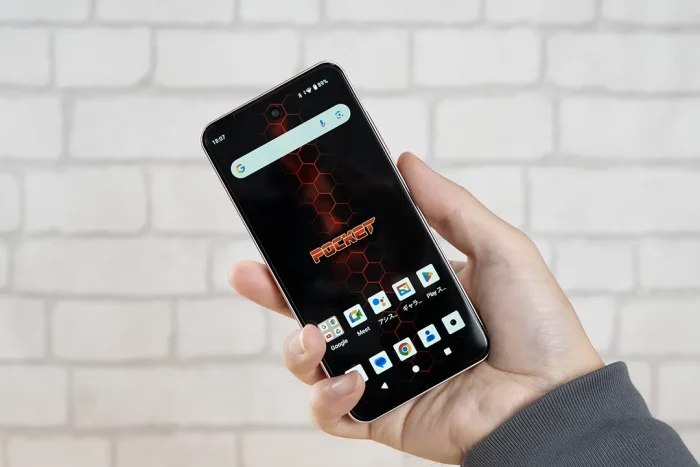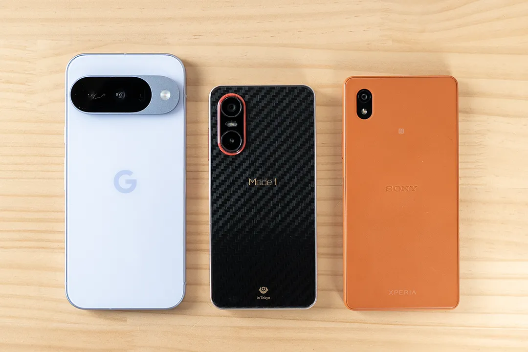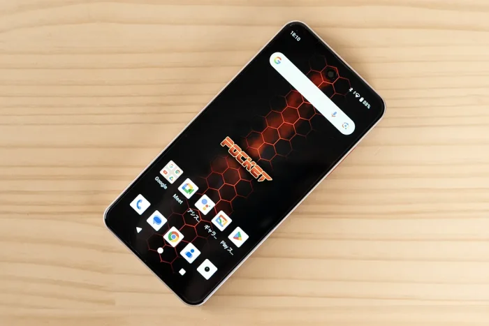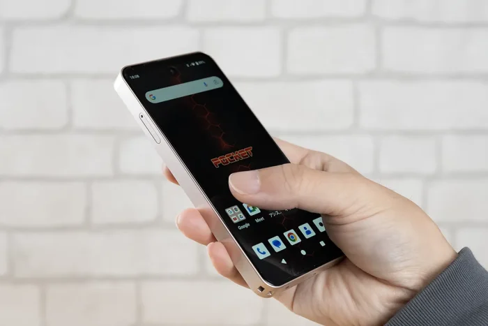 Mode1 Pocketの大きさは約132.5×63.4×10.8mmです。手持ちにコンパクトスマホがなかったのでPixel 10とXperia Ace IIIと並べてみました。Xperia Ace IIIは約140×69×8.9mmなので、それより一回り小さいくらいです。