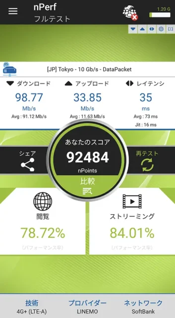 LINEMOは相変わらず高速です。うちの地域がソフトバンク回線強めというのもありますが、Speedtest.netもnPerfも安定して十分以上に出てます。キャリアのオンライン専用プランでは個人的にはかなりオススメです。