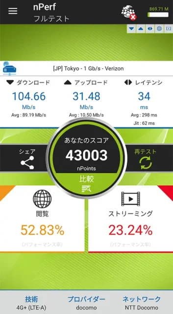 | ドコモ回線 | 104.4Mbps | 26,567pt |