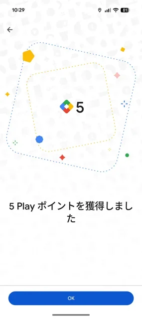 「獲得する」をタップすればPlayポイントがもらえます。私の場合はいつも5ポイントの気がします。確定なのかランダムのはずが運が悪く5ポイントなのか、わかりませんが…。