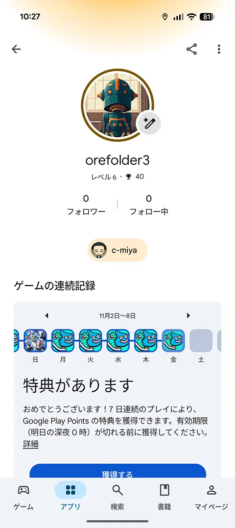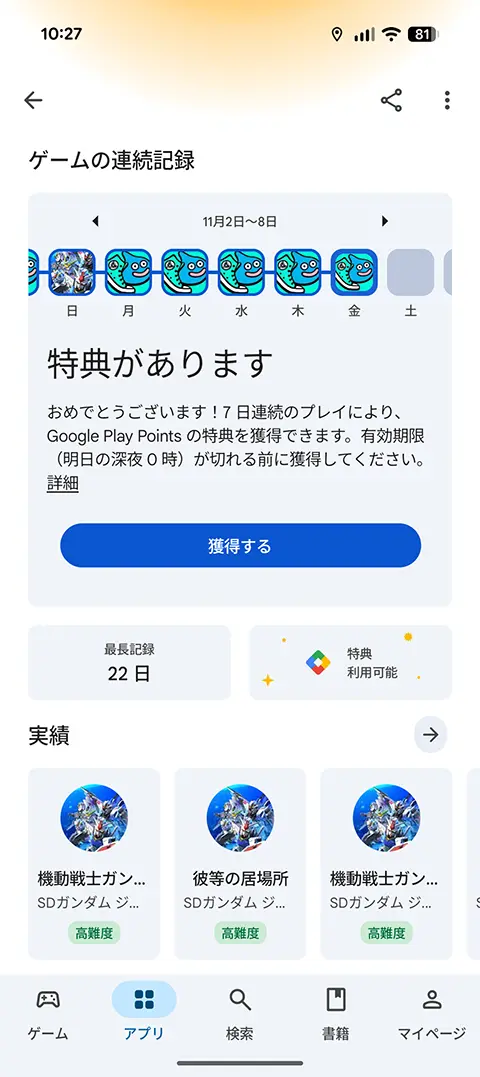 Playストアのマイページを見ると自分のゲームの連続記録が記録されています。そして1日5分以上、7日間連続でプレイすると「特典があります」と表示されます。(通知も来ます)
