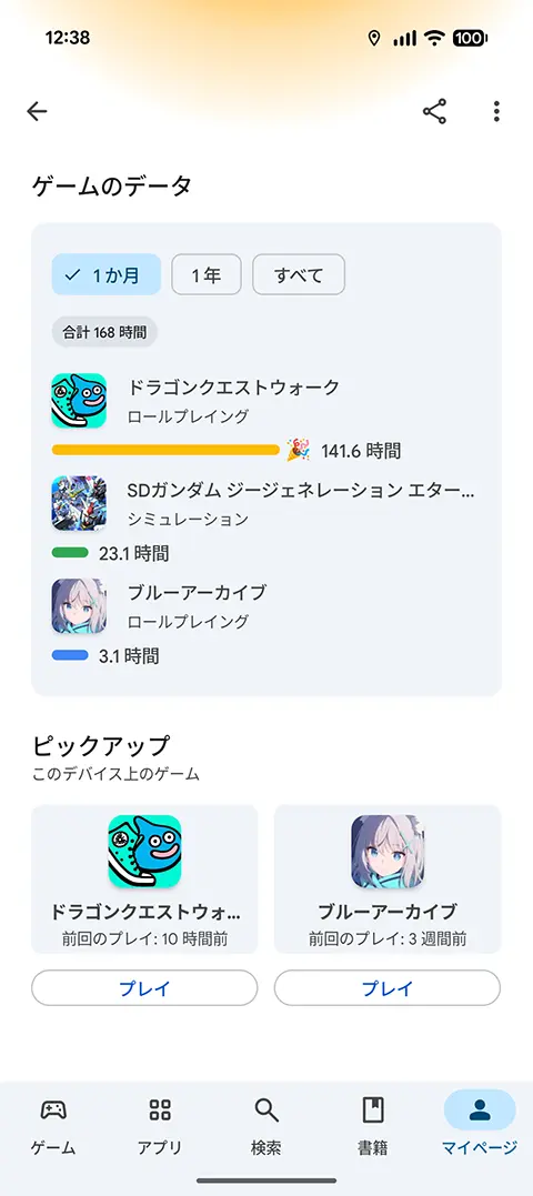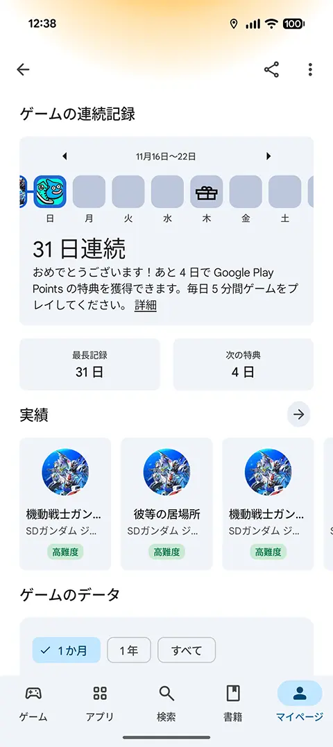 1日5分のゲームプレイなら、デイリー消化だけでそれくらいになりますし、普段からゲームしてる人には難しいことではありませんね。自分がどれくらいゲームプレイしているのか、Playストアのマイページで確かめてみるのもいいでしょう。