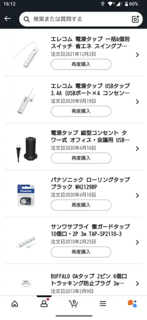 まずは家で使ってる電源タップがいつ購入したものなのか、調べてみました。私の場合はたいていAmazonで買ってるので、購入履歴から「タップ」で検索したら出てきました。オンラインショップで購入するとこういうのは便利ですね。