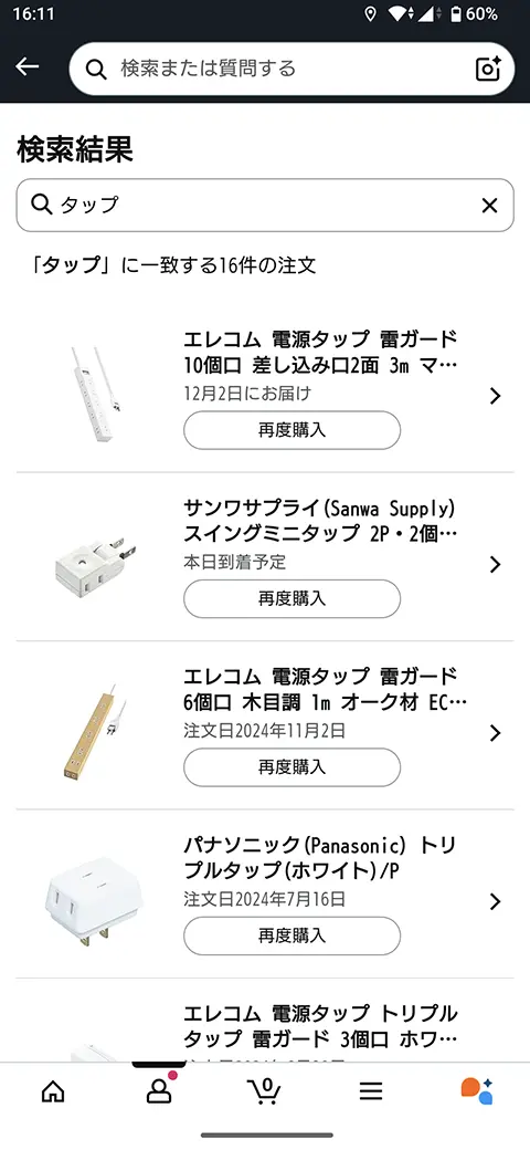 まずは家で使ってる電源タップがいつ購入したものなのか、調べてみました。私の場合はたいていAmazonで買ってるので、購入履歴から「タップ」で検索したら出てきました。オンラインショップで購入するとこういうのは便利ですね。