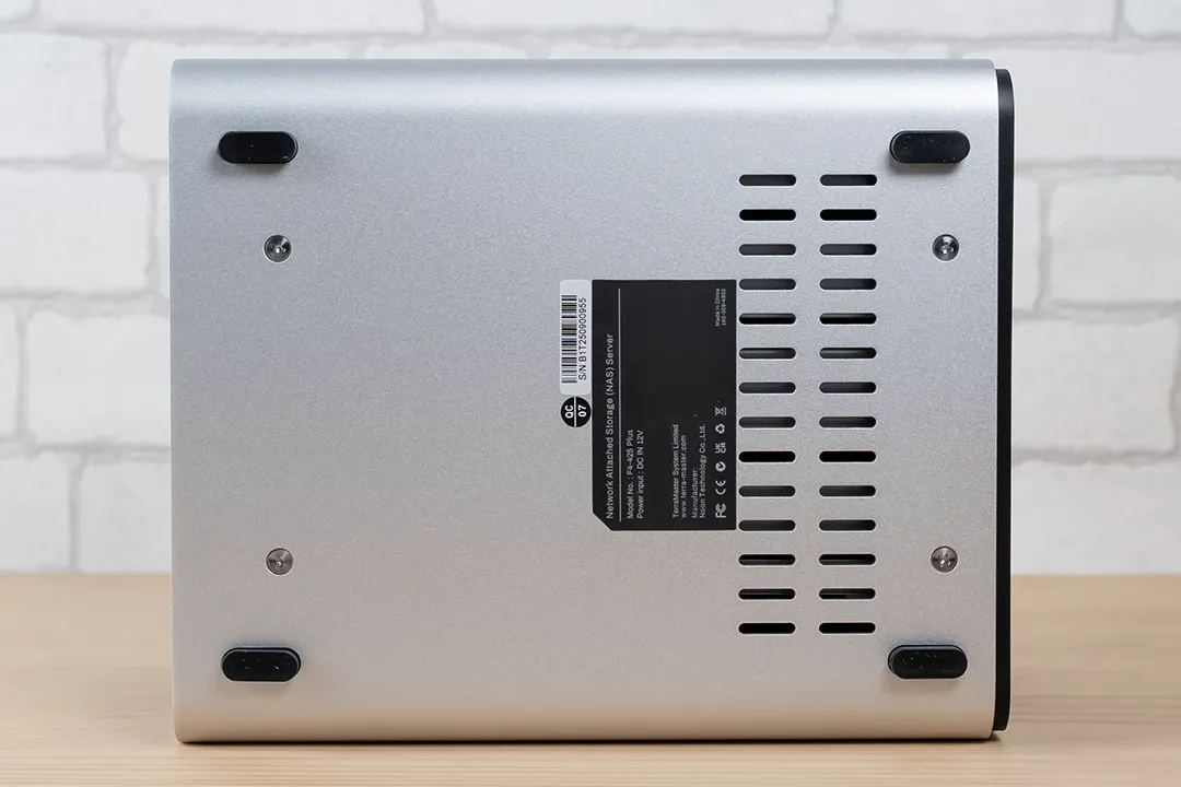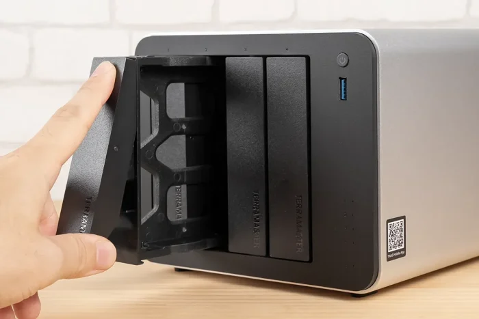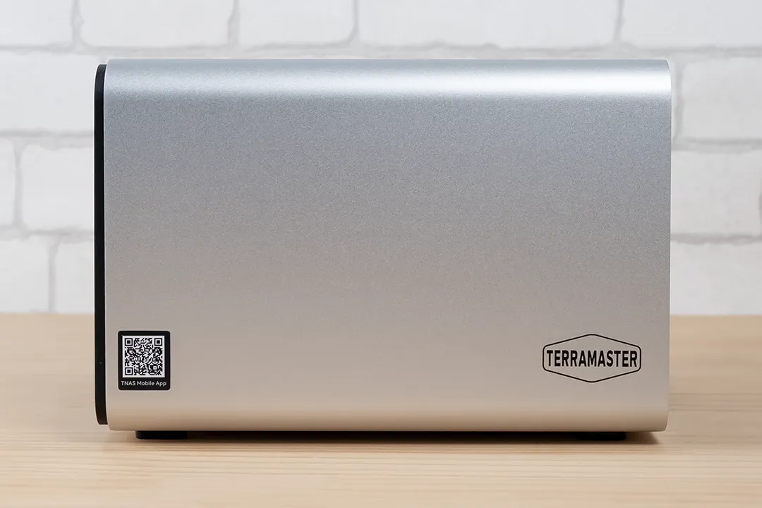 側面にはTERRAMASTERのロゴがあり、右側面にのみアプリダウンロードURLのQRコードが貼られています。