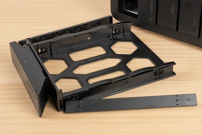 トレイの側面にあるパーツを一度外し、HDDを載せたあとにそのパーツで固定します。側面のパーツはネジなどなく、ツールレスで装着できます。