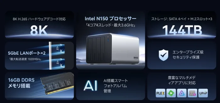 TERRAMASTER F4-425 PlusはHDDが4ベイ、M.2 SSDスロットが3基、3+4ベイ構成で最大144TBの大容量ストレージを構築可能なハイブリッドNASです。CPUにIntel N150とRAMは16GB DDR5メモリを搭載し、デュアル5GbE高速ネットワークにより最大1010MB/sの超高速転送を実現、そしてスマホアプリによる管理やAIによるプライバシー保護機能も搭載します。