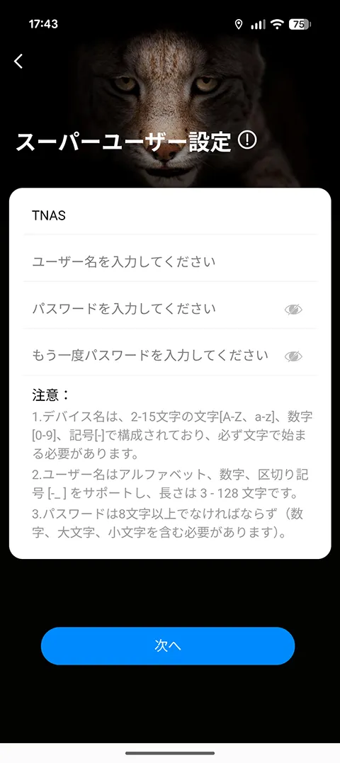 初期化が終わるとまずは管理者アカウントのようなスーパーユーザーを作成します。