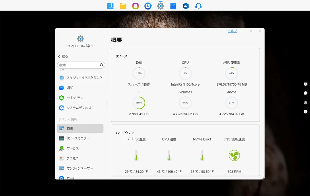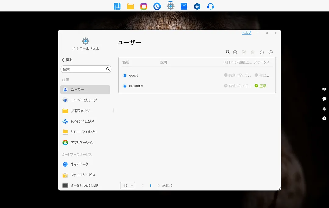 NAS自体の温度や負荷といった情報も確認できますし、ユーザーの追加・管理もできます。