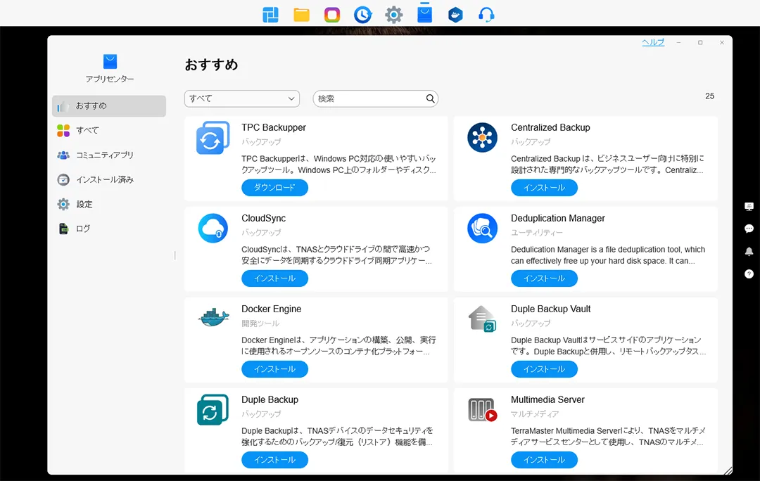 F4-425 PlusにはNAS用のOS「TOS 6」が搭載されており、ブラウザ上でファイル操作や各種設定、アプリのインストール等が可能です。