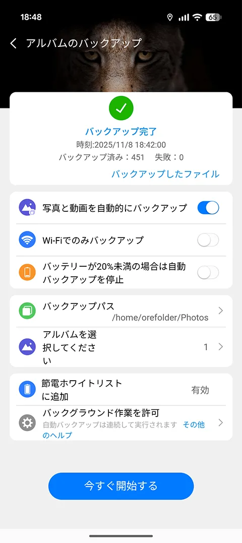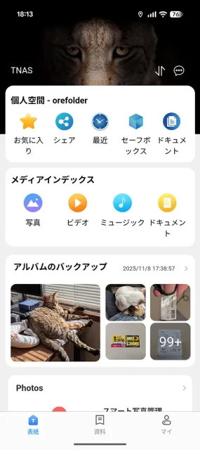 スマホのTNASアプリで「アルバムのバックアップ」を設定しておけば、スマホで撮影した写真を自動的にNASへとバックアップできます。これでスマホのストレージやGoogleフォトの容量などが楽になるのではないでしょうか。