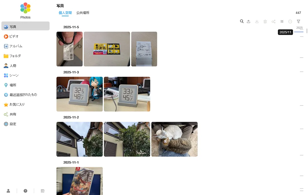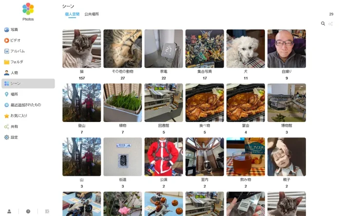AI認識で人物や場所、シーンなどでまとめて表示できます。さすがに精度はGoogleフォトのほうが上だと感じますが(Googleフォトは子供時代とかも同じ人物として認識できてすごい…。)十分実用的です。