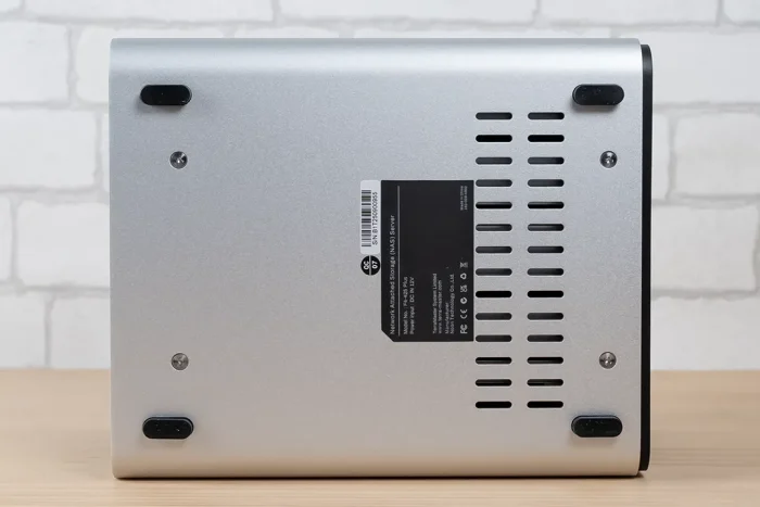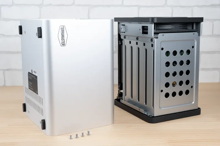 TERRAMASTER F4-425 Plusは外周をぐるっとアルミ合金製のフレームで覆われています。最初にAmazonの商品画像を見たときは白に見えたのですが、普通にアルミっぽいシルバーでした。